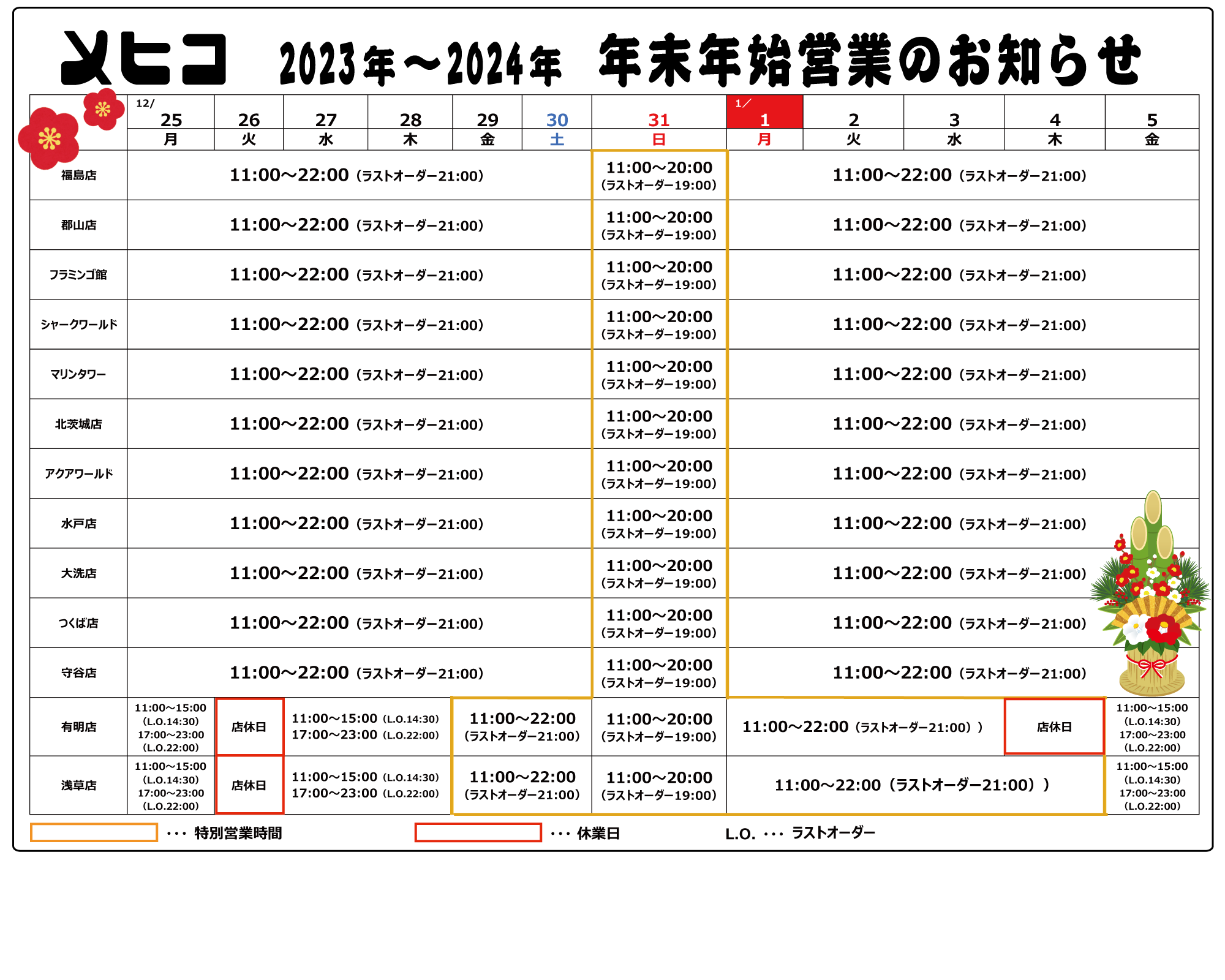 【有明店】 ・12/28〜1/5の期間中、グランドメニューとフェアメニューにて営業しております。 【有明店を除く各店舗】 ・12/25〜1/5の期間中、グランドメニューとフェアメニューにて営業しております。